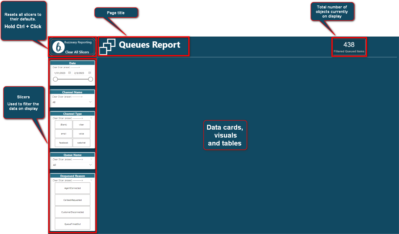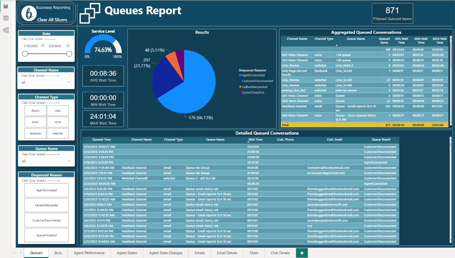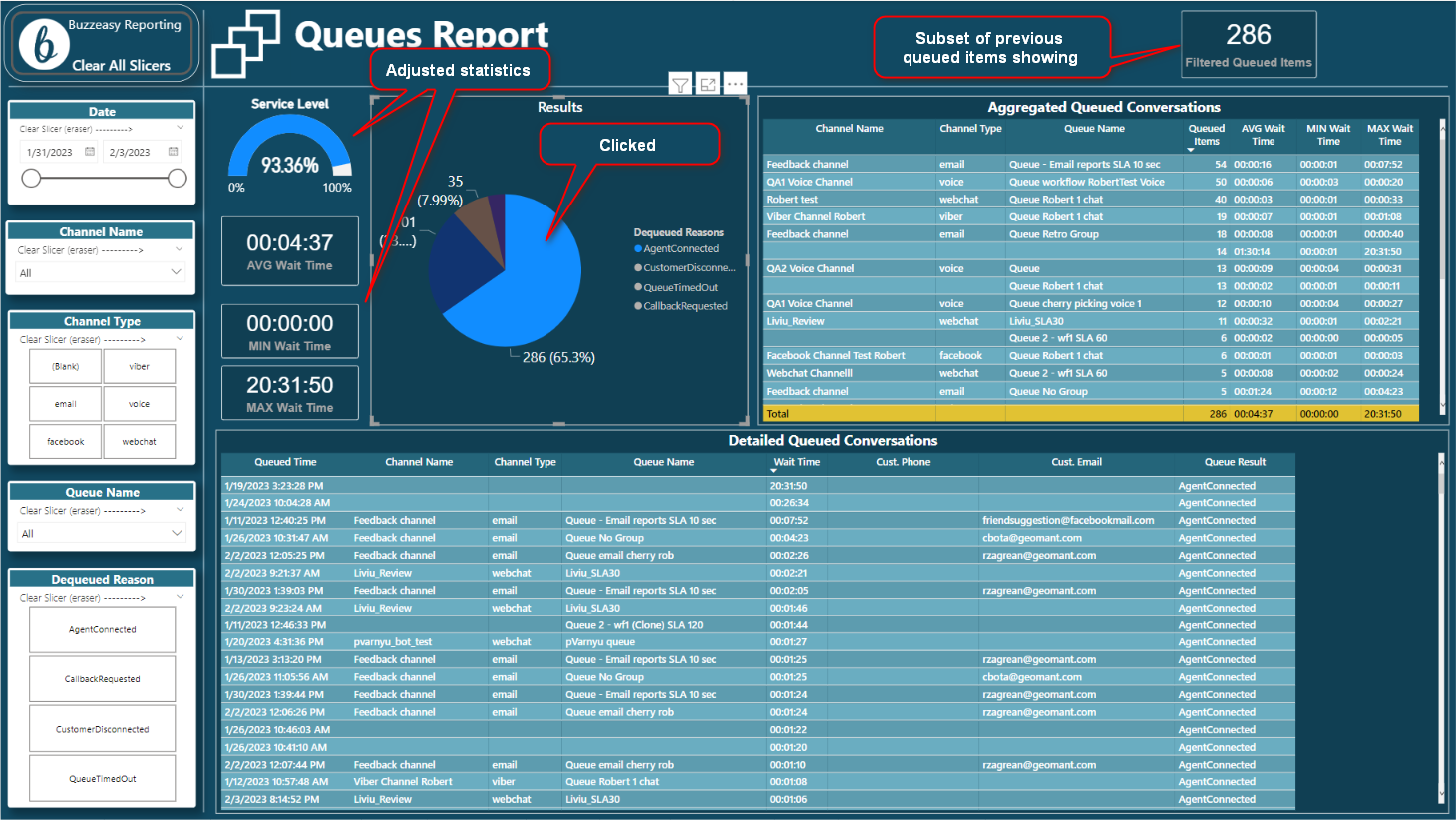E.g. click on the AgentConnected slice of the pie chart to highlight that slice of the chart and to show only queued items with this result in other visuals on the same page.