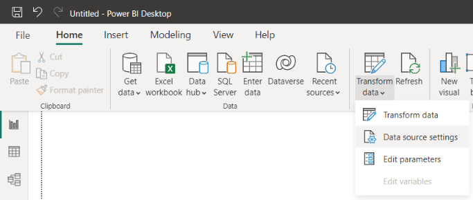 To change the data source URL or your credentials, click the downward arrow of the 'Transform data' button, then 'Data source settings'